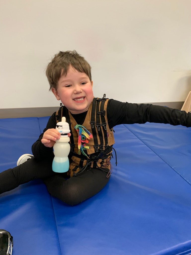 He did get to wear the Neurosuit for 2 hours today during some of his PT. We call it his “super suit” and tell him that it gives him magical powers.